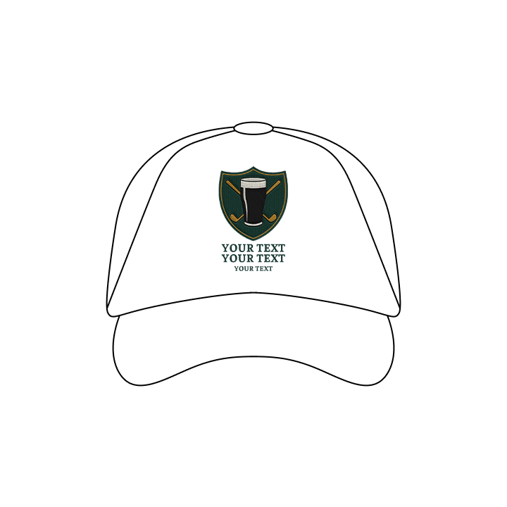 A white golfing cap with an embroidered crest that has a pint of Guinness in front of golf clubs that cross over each other in an X shape with space for three lines of custom text Back Drinks Crest Golf Tour CapTour - Drinks Crest Golf Cap - back viewTour - Drinks Crest Golf Cap - zoom viewFirst Line of TextSecond Line of TextThird Line of Text