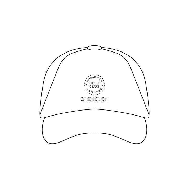 An embroidered golf cap that reads upload your golf club crest here with optional text line 1 and optional text line 2 Back Upload Your Golf Crest CapUpload Your Golf Crest Golf Cap - back viewUpload Your Golf Crest Golf Cap - zoom viewOptional Text Line OneOptional Text Line Two