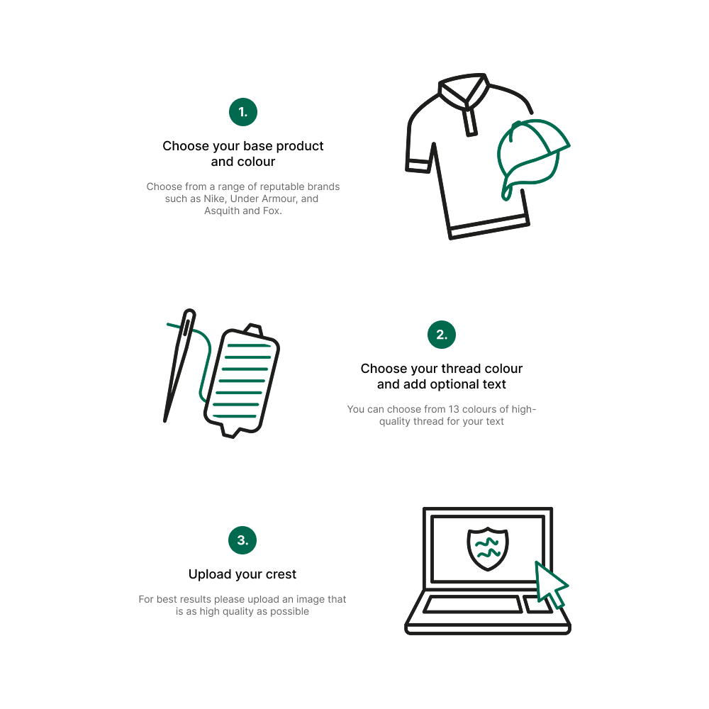 An informational image reading we’ll embroider your design onto the shirts, customise the design with your crest/image, bases range cost-effective to premium