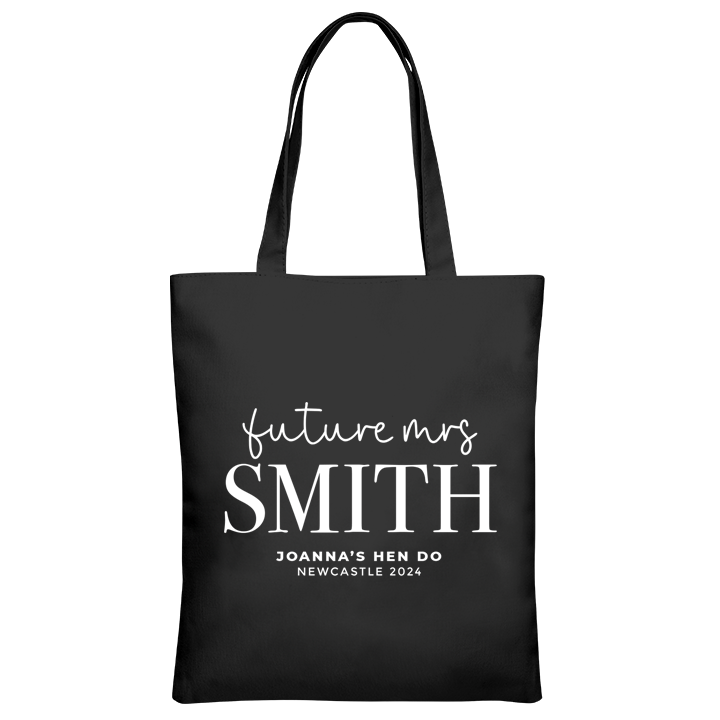 Future Mrs Lettering Tote Bag - front viewBack Future Mrs Hen Do Tote BagFuture Mrs Lettering Tote Bag - back view'Future Mrs Lettering Tote Bag - zoom view'First Line of TextSecond Line of TextThird Line of TextName on Back