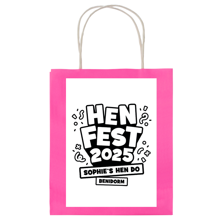 Hen Fest Gift Bag - front viewBack Hen Fest Gift Bag - back view'Hen Fest Gift Bag - zoom view'First Line of TextSecond Line of TextName on Back