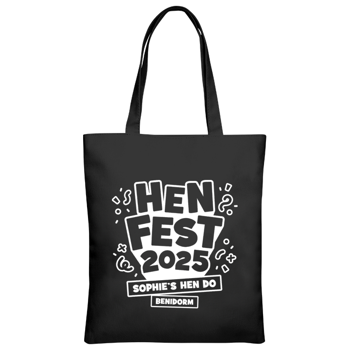 Hen Fest Tote Bag - front viewBack Hen Fest Hen Do Tote BagHen Fest Tote Bag - back view'Hen Fest Tote Bag - zoom view'First Line of TextSecond Line of TextName on Back