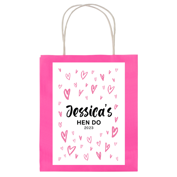 Hen Party Hearts Gift Bag - front viewBack Hen Party Hearts Gift Bag - back view'Hen Party Hearts Gift Bag - zoom view'First Line of TextSecond Line of TextName on Back