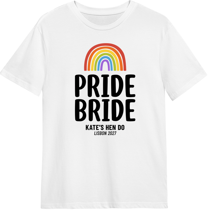 A queer custom hen do t-shirt that reads Pride Bride with rainbow design and custom text that says Katie's Hen Do Lisbon 2027 Back Pride Bride Hen Do T-ShirtsPride Bride T-Shirt - back view'Pride Bride T-Shirt - zoom view'First Line of TextSecond Line of Text