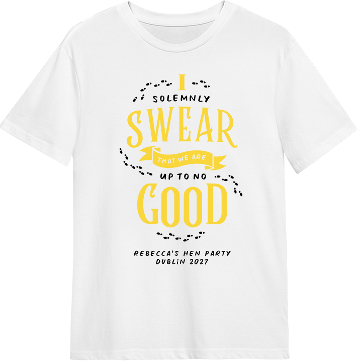 Let the mischief officially begin with this Marauder’s Map-inspired hen do t-shirt featuring the iconic phrase “I Solemnly Swear That We Are Up To No Good”, finished with a playful footprints design. This design is perfect for hens who love a little magic mixed with their mayhem.