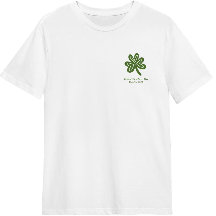 A St Paddy's themed hen do shirt with a pocket design of a clover with the custom text Heidi's Hen Do Dublin 2028 Back Paddy's Hen Do T-Shirts Paddy's Hen T-Shirt - back view'Paddy's Hen T-Shirt - zoom view'First Line of TextSecond Line of Text