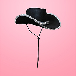 New IconA woman wearing a black cowboy hat with a sparkly silver trim.