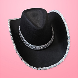 This classic black cowboy hat has silver sequins around the headband and also the brim. They are one size fits most and they come with an adjustable fastening. The hats also come in eye-catching Pink and dazzling White.