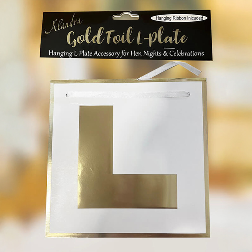 This gold foil L plate measures 17 X 17 cm and comes with a hanging ribbon. It would look perfect as part of your hen do decor, especially if you're going for a gold theme. Check out our Woo Hoo Hen Do Collection for more dazzling gold decor and accessories.