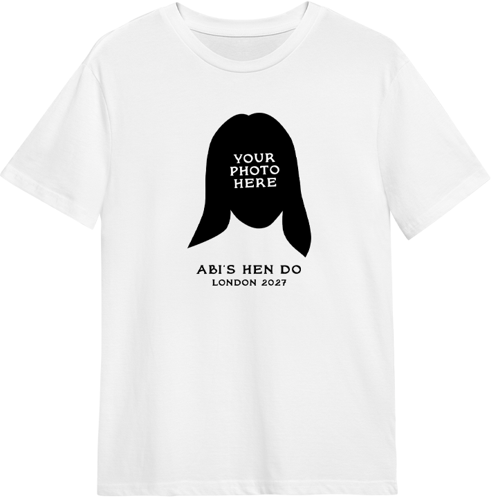 A custom hen do shirt that can be customised with a face picture and two lines of custom text Back Simple Photo Print T-Shirt Simple Photo Print T-Shirt - back view'Simple Photo Print T-Shirt - zoom view'First Line of TextSecond Line of TextName on BackNumber on Back
