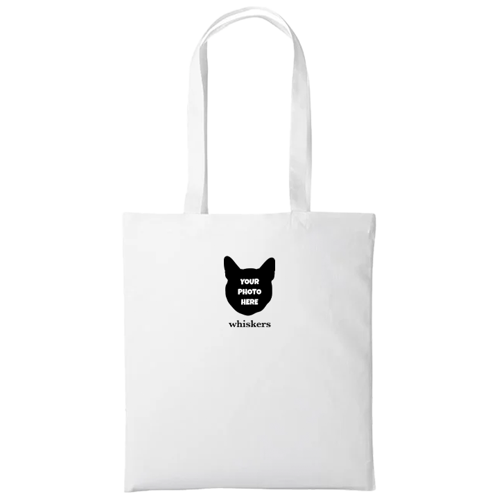 A white tote bag that can be customised with the face of a pet and up to two lines of custom text Pet Photo Simple Print Tote Bag - back view'Pet Photo Simple Print Tote Bag - zoom view'First Line of Text
