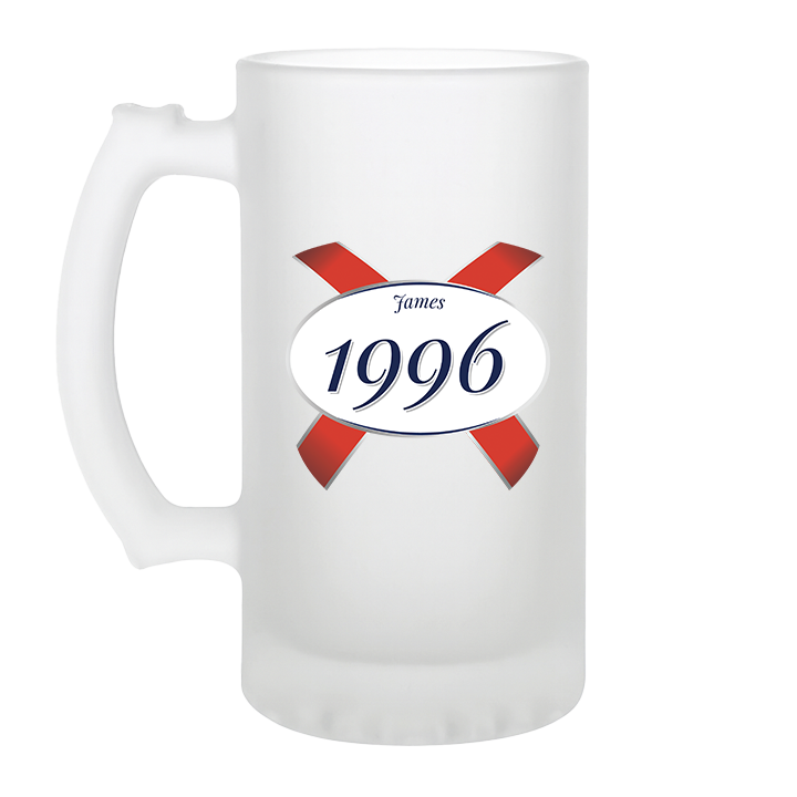 A custom 30th birthday stein with frosted glass and a Kronebourg 1664 design where the 1664 has been swapped for 1996 and has the custom text James on it 1664 - 30th Glassware - back view'1664 - 30th Glassware - zoom view'First Line of TextSecond Line of Text