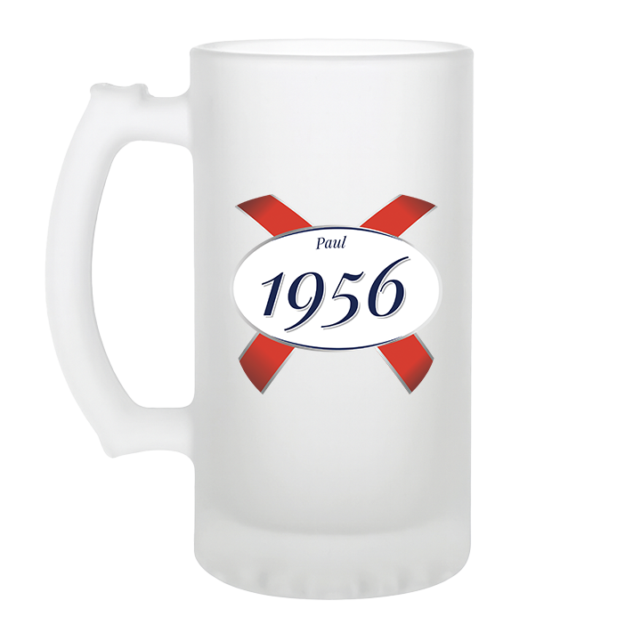 A custom 70th birthday stein with frosted glass and a Kronebourg 1664 design where the 1664 has been swapped for 1956 and has the custom text Paul on it 1664 - 70th Glassware - back view'1664 - 70th Glassware - zoom view'First Line of TextSecond Line of Text