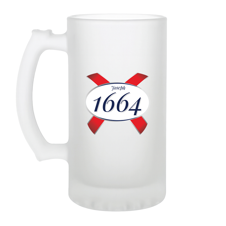 A custom Kronenbourg-inspired birthday stein with frosted glass that reads Joseph 1664 1664 Any Age Glassware - back view'1664 Any Age Glassware - zoom view'First Line of TextSecond Line of Text