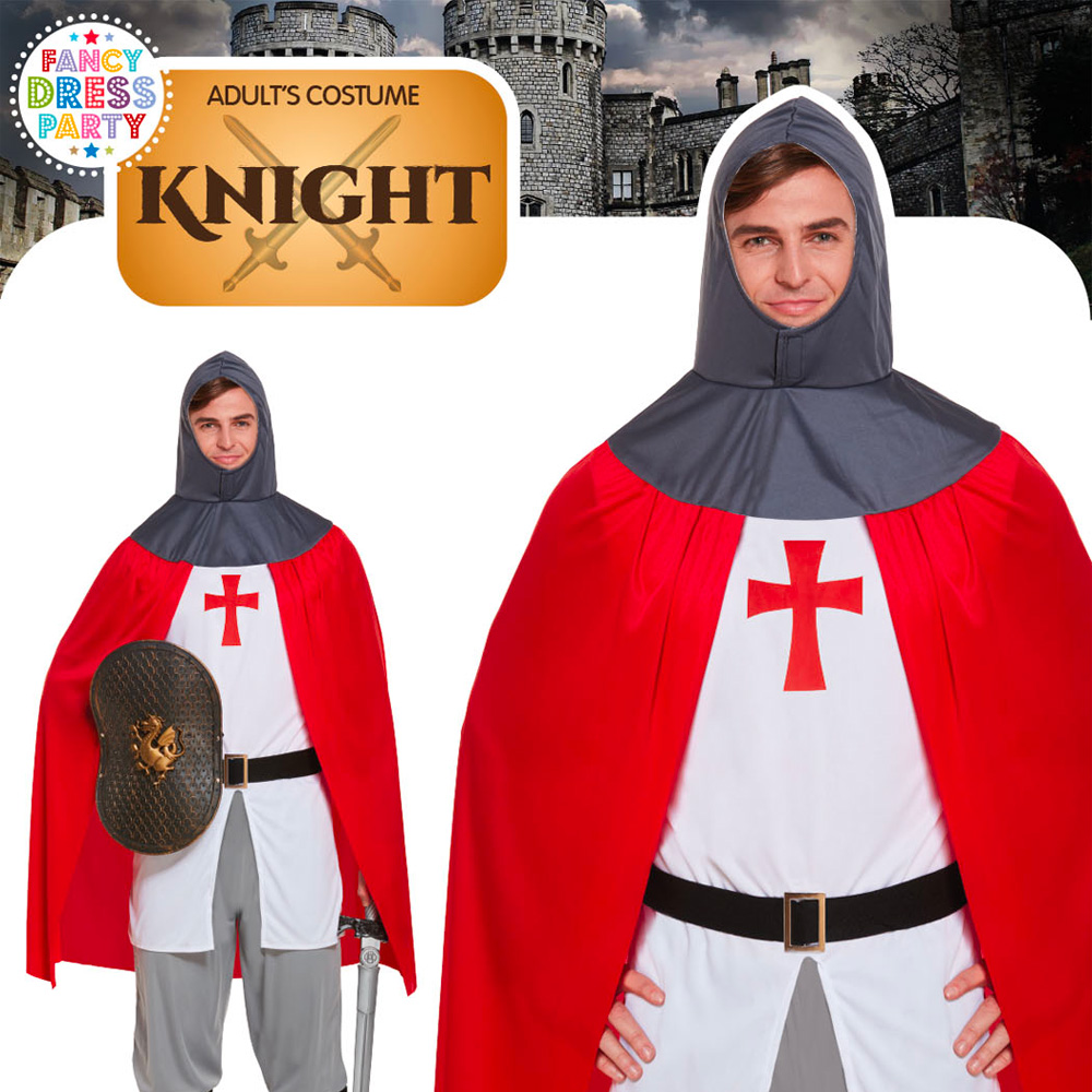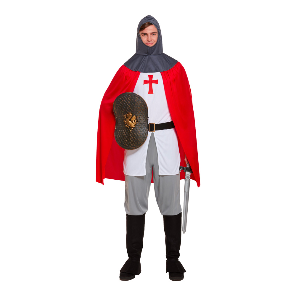 The costume consists of a red cape that has a hood attached, a top with a red cross on it, a black belt with a silver coloured buckle, grey trousers and boot covers. It's one size fits most.
