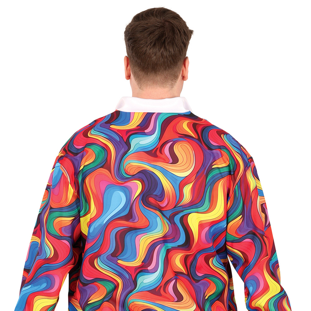 • A view of the back of a male model wearing a very bright coloured tracksuit that has a psychedelic pattern