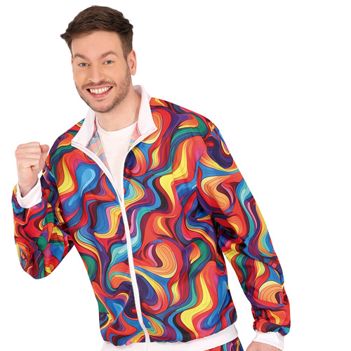• A male model wearing a very bright coloured tracksuit that has a psychedelic pattern