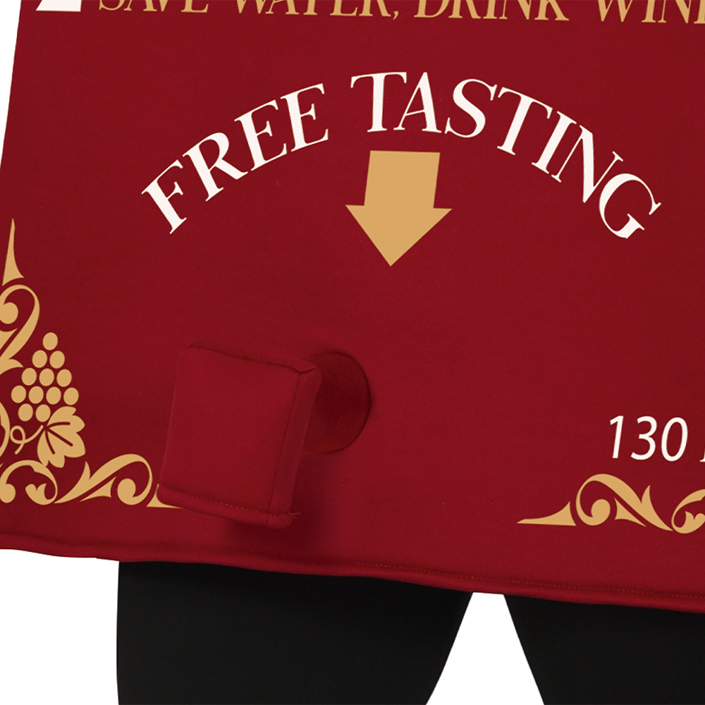 Our Red Wine Box Costume is one size fits most and has a cheeky nozzle at the bottom with a sign pointing to it that reads ‘Free tasting’. There’s even a little plastic container and tube included which means you could actually put a bit of wine in it if you wanted.