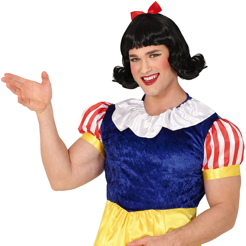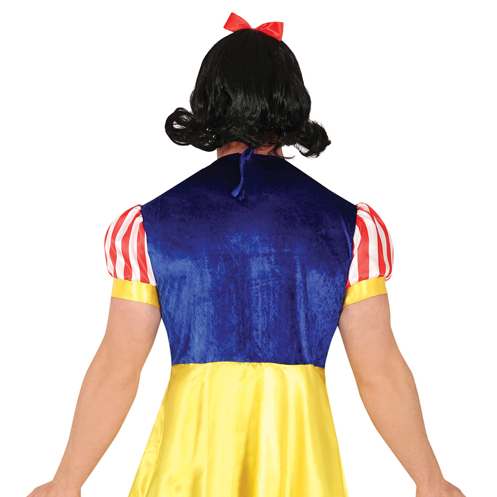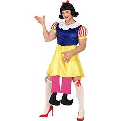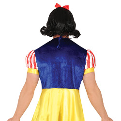 The satisfied princess costume consists of a Snow White dress and the dwarf’s legs and feet coming out of the bottom of it. The dress has a white ruffled collar and puffy red and white sleeves. You probably don’t need us to tell you what the dwarf is doing under there but put it this way…. It’s the reason why the princess is satisfied.