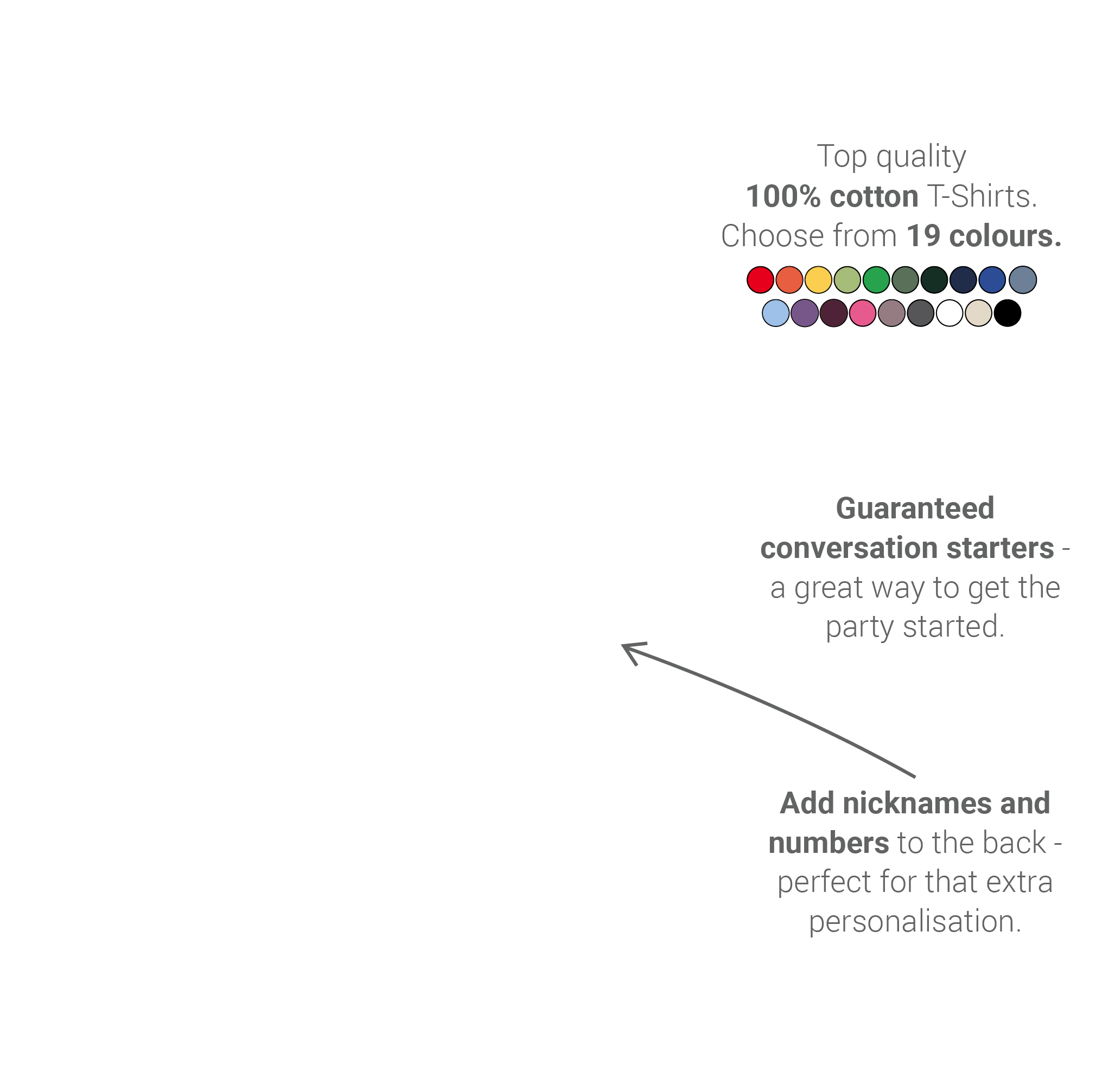 Please note: We don't need all details to be perfect at this stage. Before your order is printed we will send proofs for you to approve and allow you to make final alterations to sizes, colours, names and numbers. We’ll also allow you to add or remove t-shirts as required. We expect to send you a proof within 24 hours and print to take 48 hours once we have your approval.